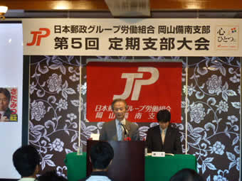 JP労組支部大会 - 岡山東備 同−岡山その後、自宅に帰って、昼食。そこに友人が今日の釣果を持って来てくれました。29センチもある超大型のキスで、直前まで生きていたのを、早速刺身で頂きました。12時半に出て、13時から40分ほど、やはりJP労組の岡山備南支部の定期大会に出席し、同様に来賓挨拶をしました。挨拶内容はいずれも、まず改正郵政民営化法について、次に原発事故対応、そして社会保障と税の一体改革、最後が衆参の選挙への支援要請です。
