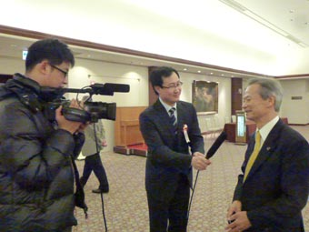 日中友好新年会 - 乾杯 同 - 加藤会長 同 - 村山元首相 同 - 丹羽前大使 同 - 韓公使 同 - テレビ取材