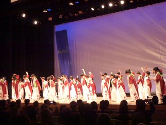 同 - 勝山高校書道部の作品津山市は、鶴山桜太鼓。久米南町の北山神社神楽は、2頭の大人と1頭の子どもの獅子舞。美作市の岡山湯郷BelleプティU-12は、女子プロサッカーチーム湯郷ベルの子ども版です。西粟倉村は、あわくら太鼓。吉井川流域の小中高校生による吉井川舟唄踊りが続き、勝央町は「まさかり担いだ金太郎…」の坂田金時の終焉の地ということで、小学生による金時太鼓。美咲町は、旭たまごKIDSによる卵かけご飯のダンス。鏡野町は、鶴喜こども銭太鼓です。新庄村の子どもたちは、名産の姫の餅を4人で搗くダンス。奈義町こども歌舞伎は、同町の横仙歌舞伎の伝承を目指して開講した教室の名優たちで、白波5人男の台詞を見事に演じました。真庭市は、湯原温泉のオオサンショウウオ、はんざきのダンス。最後は旭川流域の真庭市北房地区の呰部と阿口の子どもたちによる蛍イメージのダンスです。最後に全員が登壇し、美作大学の津田准教授の指導によるリズムトレーニングをし、10市町村の代表者も登壇し、津山市の宮地市長と真庭市の太田市長が閉会の挨拶をして、終了。