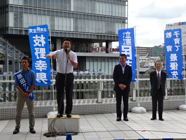 短時間で切り上げて岡山駅西口に行き、16時15分から参院選岡山に立憲民主党公認・野党統一候補として挑戦している原田謙介さんの街頭演説会に出席しました。高原俊彦県議の司会で、まず立憲民主党の高井崇志さん、次に国民民主党の津村啓介さんが挨拶し、私も紹介されました。そこに原田候補が到着し、多数並んだテレビカメラの束になったマイクを握りしめて力強く未来に向けた政治への思いを語りました。心配された声は落ち着き、最後は良く通る声を張り上げました。