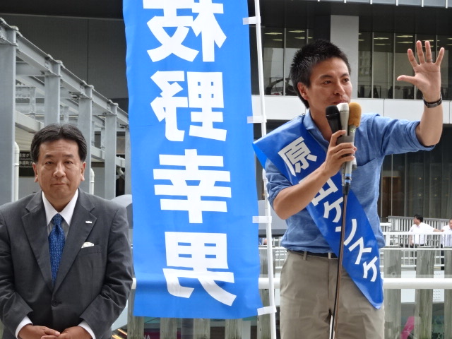 その途中で立憲民主党の枝野幸男代表が到着し、駅ビルのデッキを埋め尽くした聴衆に生活重視の政治への転換を訴え、野党結集で駒を進める原田候補を支援するよう、有権者一人ひとりから始める未来への選択を訴えました。