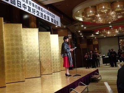 19時から2時間弱、歓迎会に出席しました。まず主要来賓による記念写真撮影に参加し、私たちはテーブル席に着き、主催者の日中友好協会の丹羽宇一郎会長と中国人民対外友協の李会長の各挨拶があり、その他の来賓挨拶に続いて岡山県日中友好協会の景山貢明会長の音頭で乾杯をして、賑やかな懇親となり、多くの友人たちと挨拶を交わしました。