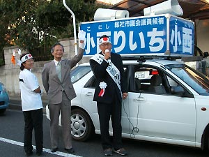 17時から1時間、民主党推薦候補の選挙カーに乗り込み、流し街宣と3ヶ所でスポット演説。姫井由美子さんも一緒でした。市民派に徹し、草の根市民の支援に頼る選挙で、必死の訴えを続けています。
