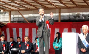 今日は7時半に自宅を発ち、8時半から、浅口市長選挙の応援に出掛けました。鴨方、金光、寄島の3町合併で新設された市で、初代市長選出の選挙で、今日が初日です。前町長で民主党推薦候補の出陣式に出席し、激励挨拶の後、9時過ぎから11時まで、選挙カーの随行車に乗り込み、途中で2ヶ所街頭での応援演説をしました。前自民党県議との一騎打ちです。