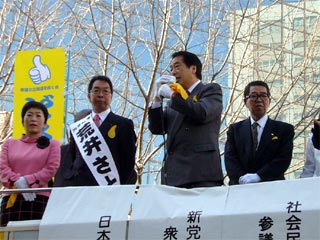 8時半前に、出陣式を行う場所に到着。先日まで国会の同僚だった候補者は、元気で集まった人々と挨拶を交わしてまわり、私もがっちり握手。やがて8時半過ぎから最初の街頭演説が始まり、民主党は菅直人代表代行が威勢の良い激励挨拶。続いて、社民党の福島党首、連合の高木会長、新党大地の鈴木代表らの挨拶の後、候補者が元気一杯に第一声を述べました。候補者は、マニフェストを進化させるとして、新たに3点を明確にしました。まず、札幌医科大学を道立に戻し、道内の医療供給の中枢機能を担わせること。次に、夕張市財政を道との連携により早期に再建すること。第3は財源で、天下りを止めることと東京事務所や知事公館などの処分の検討。数値目標も入り、ぐっと現実的になりました。