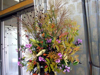 今日は10時過ぎに妻とともに議長公邸に入り、古賀文子さんが、2月にお預けした菊慈童の修復を仕上げてお持ち下さいました。立派に出来上がり、感激しました。やはり、版画の原画でした。議長室の生け花は、すっかり秋の風情となりました。