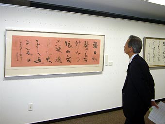 次に、天神山文化プラザで、東中国の「自由美術展」を鑑賞。矢野芳子さんは中東紛争に心を痛め、墨を使って深刻なもつれを表現していました。「テン・コレ2009」は文化プラザの新収蔵作品の展示で、河田一臼先生の「澄観」などの大作や内田鶴雲先生や小野桂華先生のかなの作品が並んでいました。「さわらび会」の墨彩画展では、主宰者の枝松國明さんがおられて案内していただきました。「いつかみた空のいろ」と題する堀越克哉さんの作品展は、県内のさまざまな風景を淡いタッチで大づかみに描いていました。最後は、「僕の幸せは不幸せの上に在る」という村上健太郎写真展で、大きな暗室の中に薄ぼんやりと、脱ぎ捨てられた靴とタバコの吸殻の写真が数多く並ぶコーナーと一隅に不洗観音の表札だけしかないコーナーがあり、若者の挑戦です。