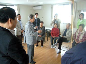 10時40分ころから30分ほど、仮設渡波第一団地を視察しました。集会所に避難の皆さんが10数人集まってくれ、最近できた自治会の会長さんらからお話を伺いました。厳寒の冬が迫ってきており、早急に暖房等の冬の備えを急いで欲しいというのは、切実な願いです。外に出ると、ボランティアのピースボートの若者数人に出会いました。