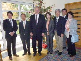ドイツ大使館昼食会 - 乾杯 同 - 記念写真9月下旬の総選挙で過半数政党がなく、連立工作が進められ、キリスト教民主同盟・社会同盟と社民党との間で180ページに及ぶ連立合意ができ、社民党の党員投票による承認手続きが進んでいるそうで、否決されれば党執行部は不信任になるとのことです。アデナウアーとドゴールの決断で結ばれたエリゼー条約では、独仏間で、年間数万人の青少年交流が行われ、数多くの姉妹都市縁組が結ばれ、自治体の名前を示す標識には姉妹都市の名前も書かれているそうです。