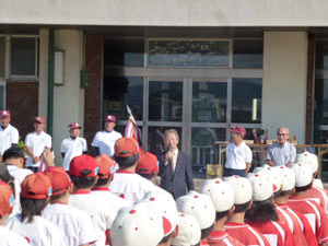 今日は、久しぶりの快晴の朝でした。8時から地元の旭操小学校の校庭で、スポーツ少年団ソフトボール部の交歓大会が開かれ、市内13チームが集まって開会式が行われました。今月初めの予定が、雨のために夏休みの最後の日となったもので、子どもたちも大変だと思います。私は挨拶で、広島の土砂災害に触れ、地元の気候に感謝しながら頑張るように激励しました。